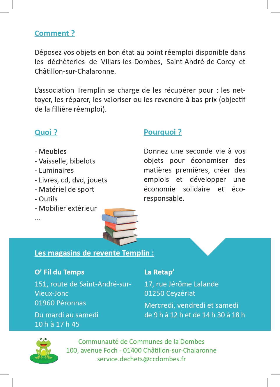 Les déchèteries de Villars-les-Dombes et Châtillon-sur-Chalaronne possèdent également un point réemploi.