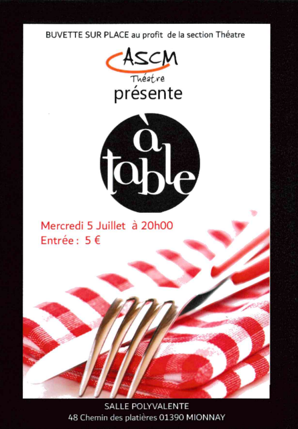 Les comédiens de l’ASCM THEATRE vous invitent le 5 juillet prochain à 20 h dans la salle des fêtes de Mionnay pour ripailler dans la joie et la bonne humeur.