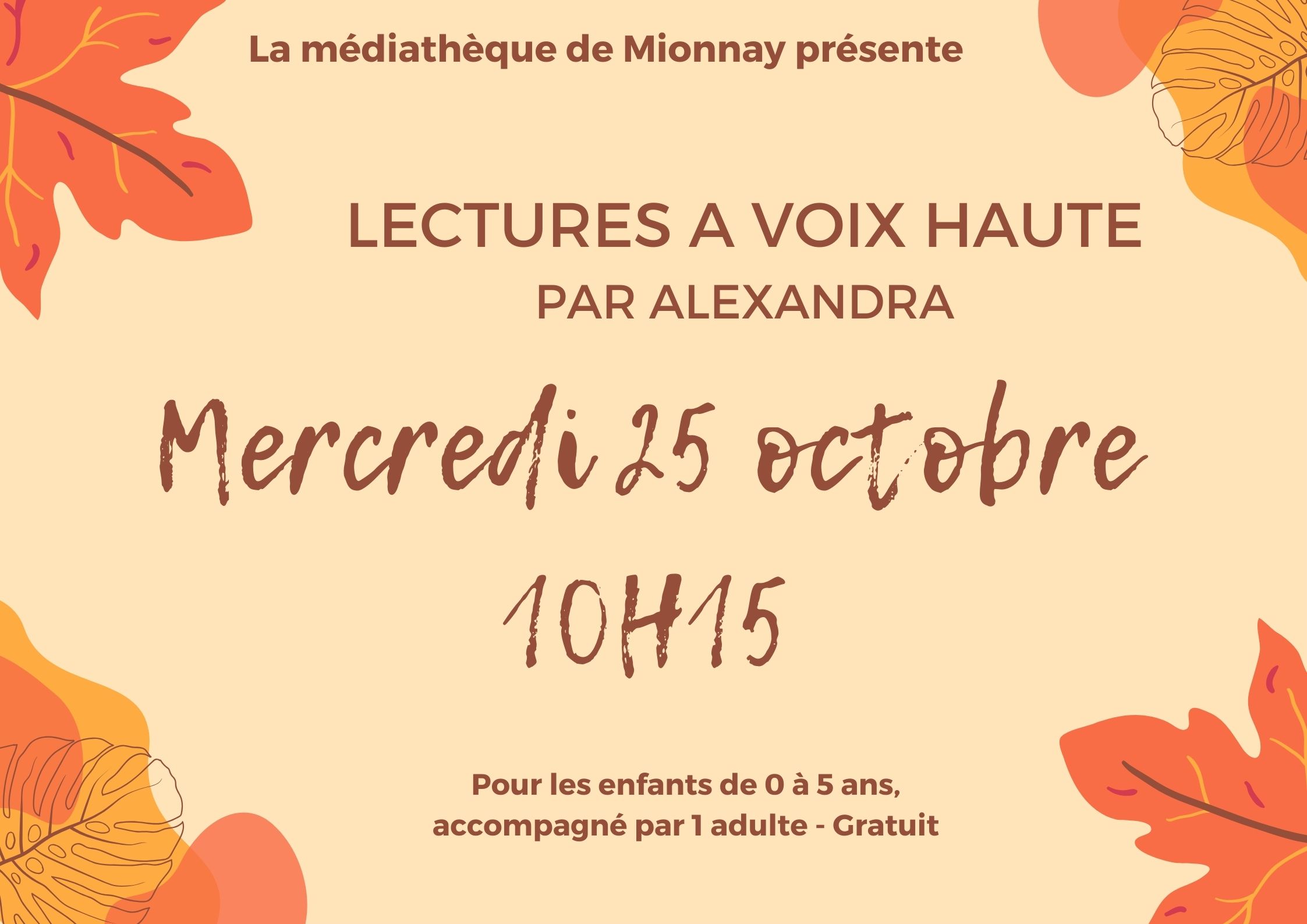 Accueil Découvertes & tourisme Agenda des évènements Séance lecture à voix haute à la Médiathèque Séance lecture à voix haute à la Médiathèque Médiathèque le mercredi 25 octobre 2023 à 10h15 Dernière mise-à-jour le 18 octobre 2023 Où ?à la Médiathèque de Mionnay Quand ?Le mercredi 25 octobre 2023 à 10h15. Au programme...