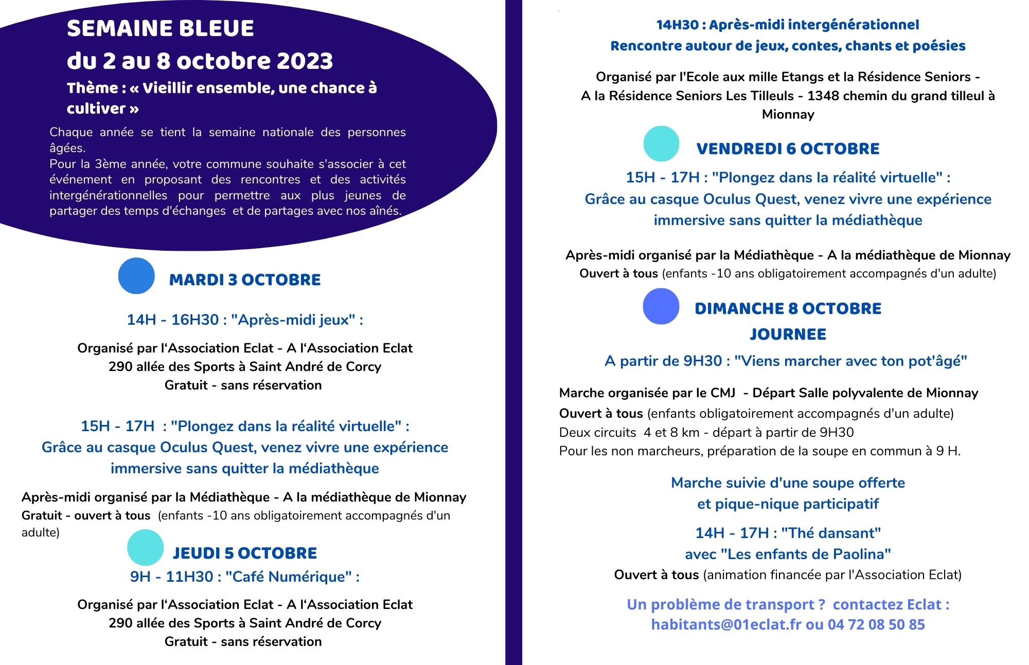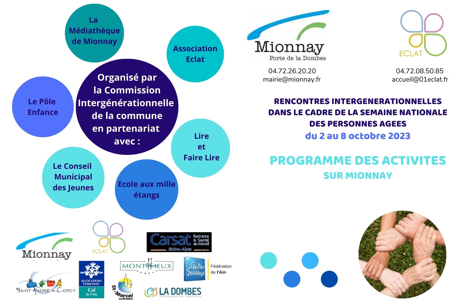 Actualités de Mionnay Jeunesse Loisirs Séniors Social Rencontres Intergénérationnelles dans le cadre de la semaine bleue La commission intergénérationnelle et ECLAT organisent : […] La commission intergénérationnelle et ECLAT organisent : la semaine bleue du 2 au 8 octobre, nombreuses animations sur Mionnay et Saint-André-de-Corcy. Thème : « Vieillir ensemble, une chance à cultiver »