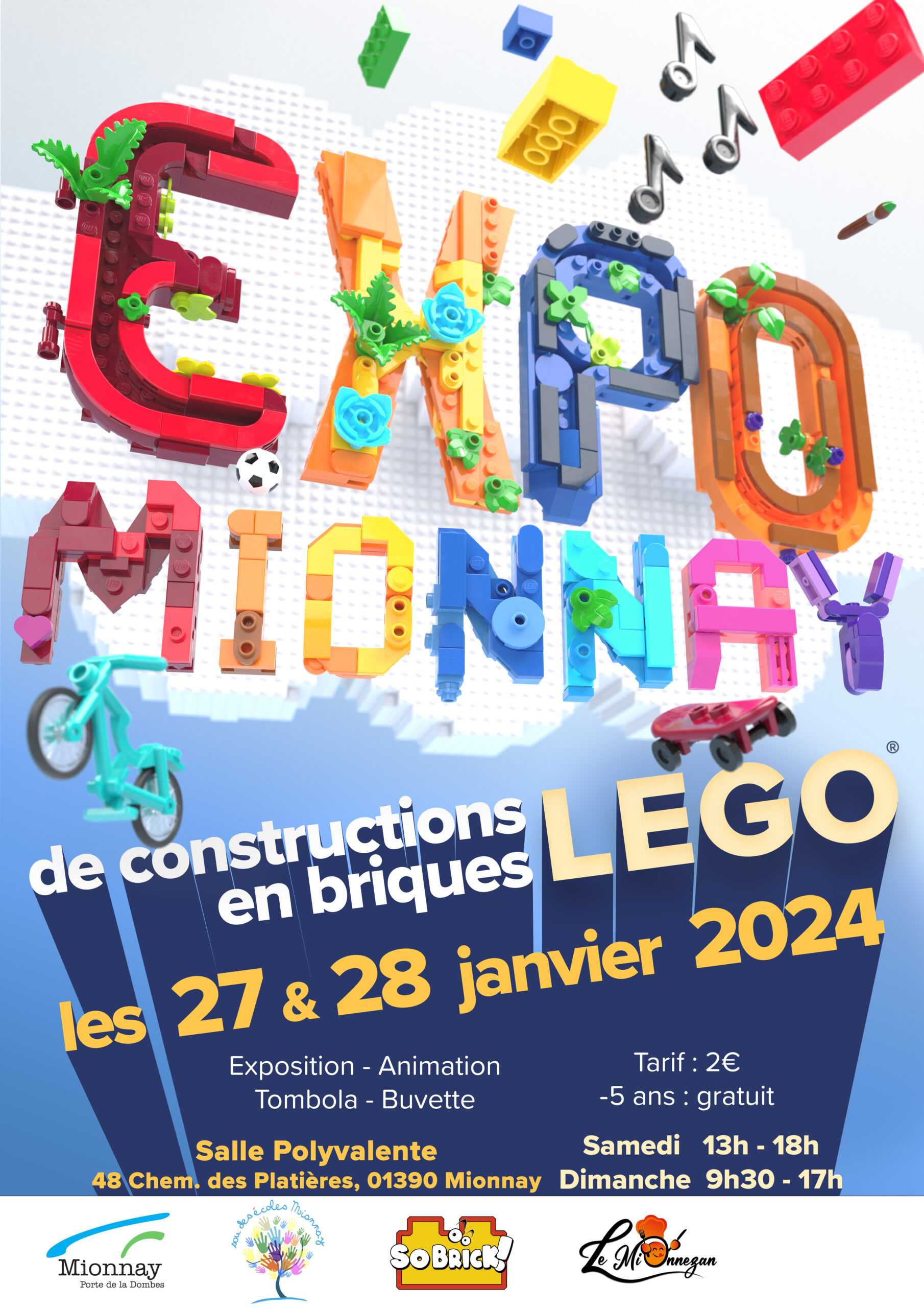 A tous les petits et grands passionnés de Lego ! En partenariat avec l’association SoBrick, Le Sou des Ecoles de Mionnay organise une exposition Lego les 27 & 28 janvier 2024. Au programme : de nombreuses œuvres en Lego, une construction participative et une tombola ! Nous vous attendons à la salle polyvalente de Mionnay, 48 chemin des Platières. Horaires d’ouverture : samedi 27 de 13h à 18h. Dimanche 28 de 9h30 à 17h.