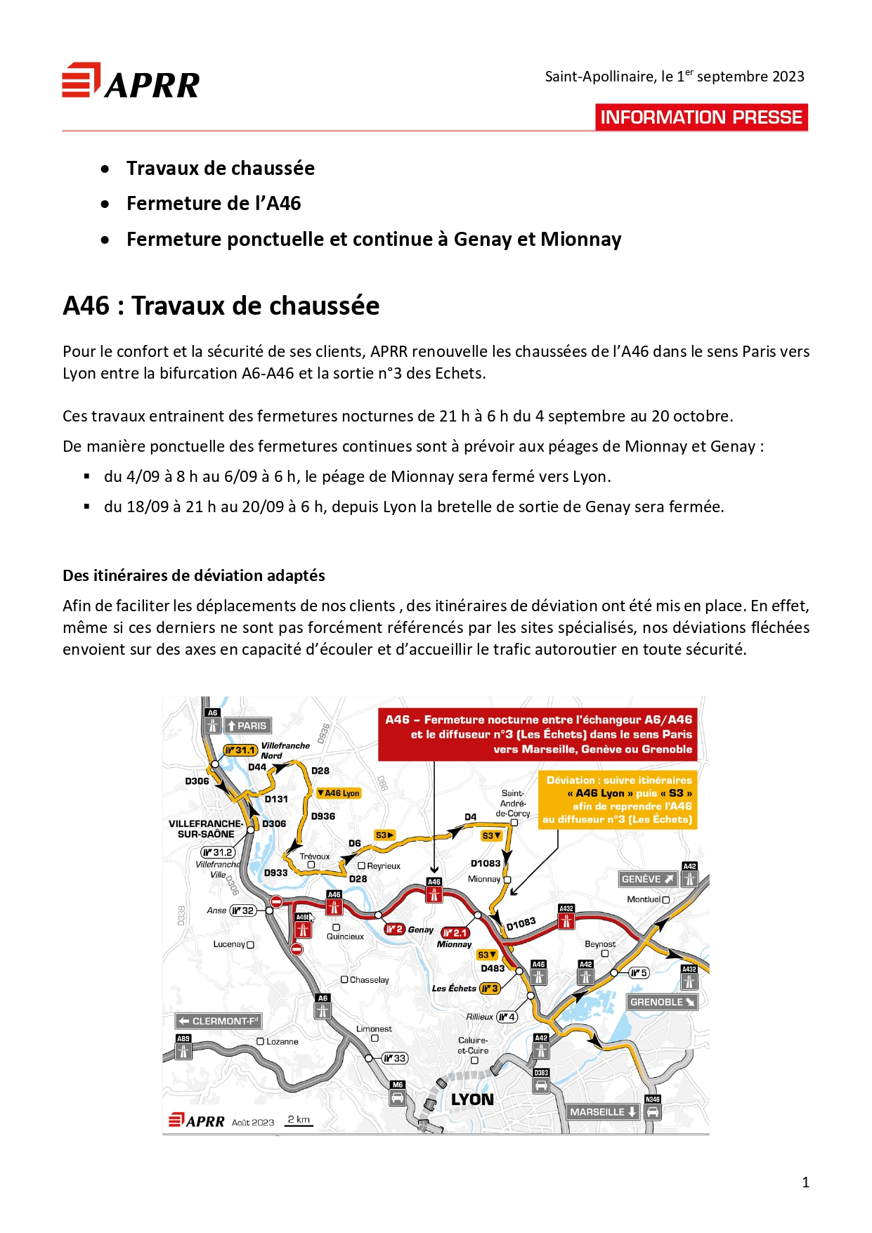 ➡ du 18/09 à 21 h au 20/09 à 6 h, depuis Lyon la bretelle de sortie de Genay sera fermée.