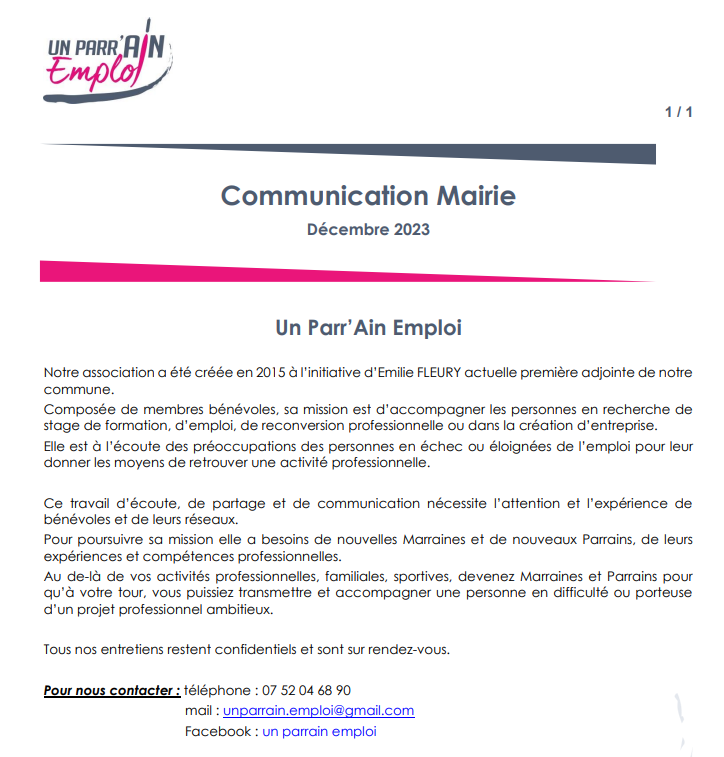 Actualités de Mionnay Associations Economie La vie à Mionnay Offres emplois Un parr’Ain Emploi 20231207 Annonce Mionnay […] 20231207 Annonce Mionnay Un parr’ain emploi Assistance projet professionnel ou stage d’entreprise sur rendez-vous – contact : 07 52 04 68 90